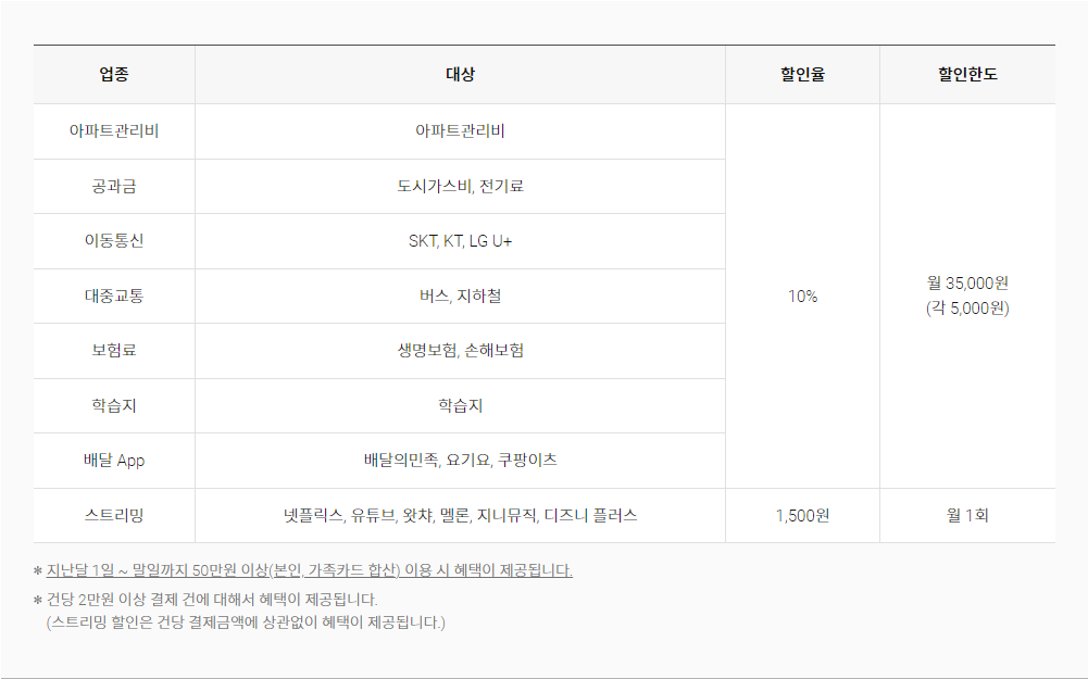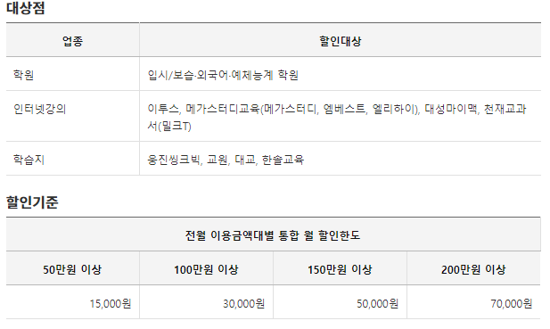 삼성의 경우, 교육비를 제외한 다른 항목들은 모두 전월 실적 50만원 이상일 경우이며, 교육비의 경우에는 차등 혜택을 주고 있습니다.