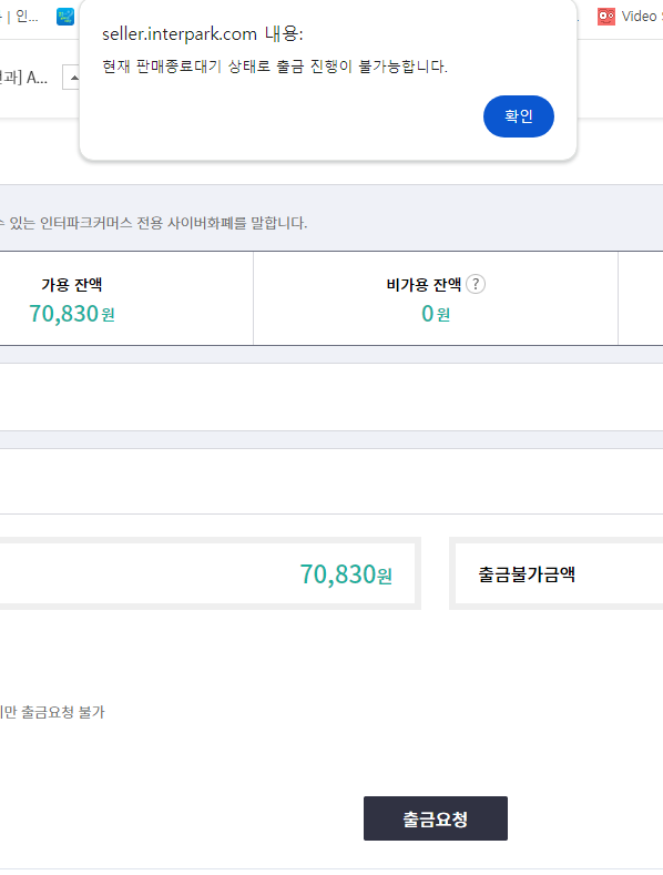 그래서 판매자 센터에 접속해보니 인증 후에 접속은 되더라구요. 그래서 출금신청을 해보려고 했더니...