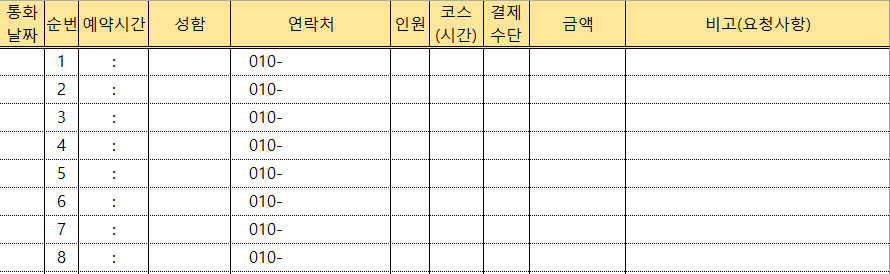 저는 이런식으로 만들어서 사용하고 있어요. 전화가 오면 바로 이 양식에 기본적으로 필요한 정보들과 나머지는 비고사항에 메모를 하면서 예약을 받고 있습니다. 저는 줄이 없거나 칸이 정해져 있지 않으면 글자를 크게 종이 낭비가 심하게 기록을 하는 스타일이라 이런 표가 필수로 필요한 사람이거든요. 예약시간이나 연락처에는 미리 공통사항을 적어놔서 조금이라도 불필요한 작업을 줄이려고 했어요 ^^