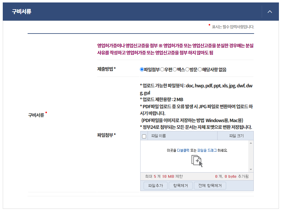 내용을 확인한 후, 첨부서류 탭을 클릭하여, 영업신고증을 첨부해 줍니다.