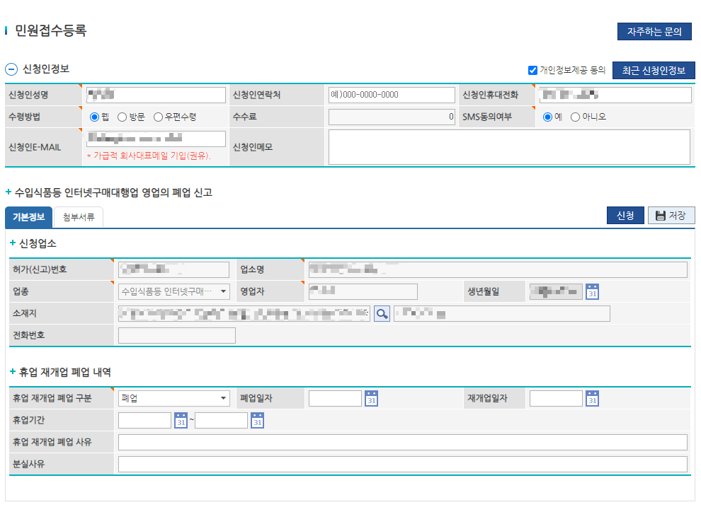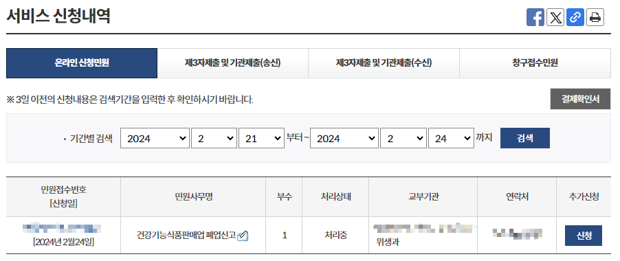 모두 작성을 하고, 건강기능식품영업신고증을 첨부하여 민원신청하기를 누르니,