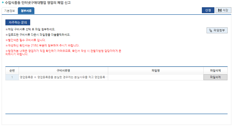 내용을 확인한 후, 첨부서류 탭을 클릭하여, 영업신고증을 첨부해 줍니다.